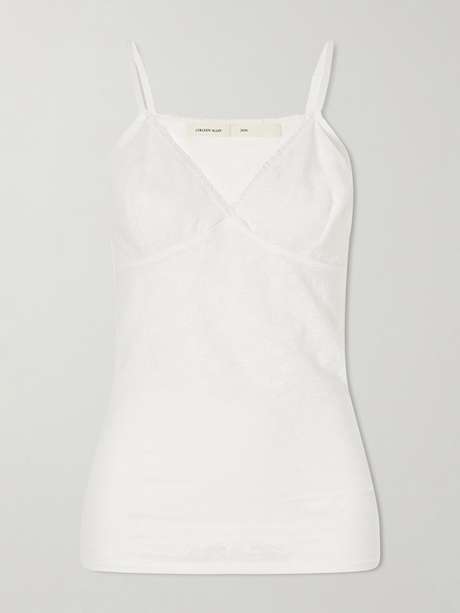 Romantic and delicately nostalgic, the 'Floral Vintage' tank top by Colleen Allen draws inspiration from lingerie silhouettes. Crafted from stretch mesh with a subtle floral pattern, it features lace trim at the neckline and slender adjustable straps.
