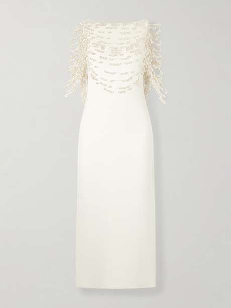 Cult Gaia's 'Meri' midi dress is overlaid with a faux pearl crocheted poncho that can be removed for a simpler look. It's finely knitted for a close fit through the body and has an elegant pencil shape and low scoop back. It would make such a memorable choice for a rehearsal dinner.