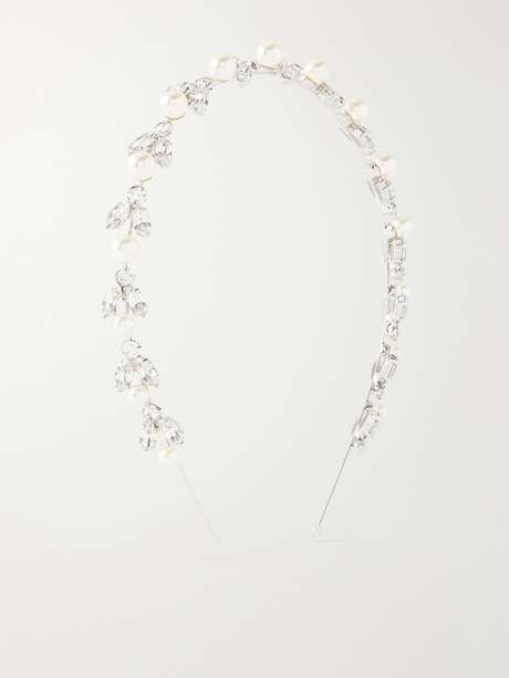 Jennifer Behr’s ‘Kamila’ headband is detailed with crystals and pearl accents along a slim metal frame. Handmade in New York, it curves gently for a refined fit.