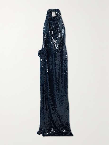 The party doesn't start until you arrive in Magda Butrym's floor-sweeping dress. Made from weightless tulle embellished with scores of sequins, it has a draped cowl neckline and is appliquéd with a single rose corsage at the hip. The deep splits create plenty of drama.