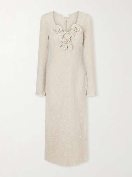 Magda Butrym’s creative vision is distilled into more understated designs for Spring '26. Made from Lyocell-blend that's shirred for texture, this midi dress is decorated with deconstructed floral appliqués along the neckline.