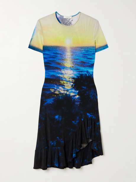 Rabanne's mini dress captures the shifting tones of dusk with an all-over print inspired by a sun setting on the horizon. Made from jersey blended with plenty of stretch, it falls to an asymmetric hemline.