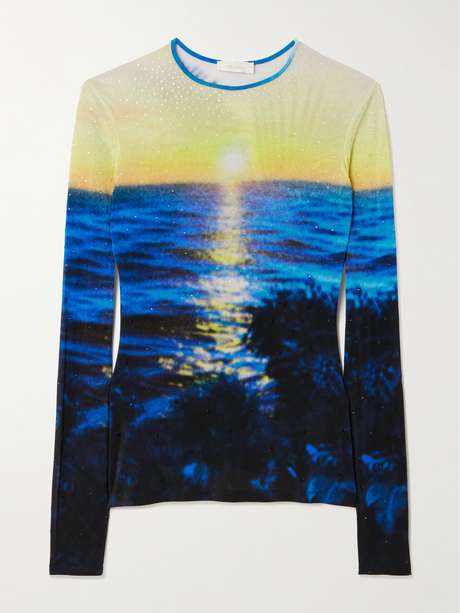 Rabanne's 'Haut' T-shirt adds a touch of shine to everyday dressing. Embellished with crystals, it's cut from vibrant sunset-printed jersey blended with some linen and cotton.