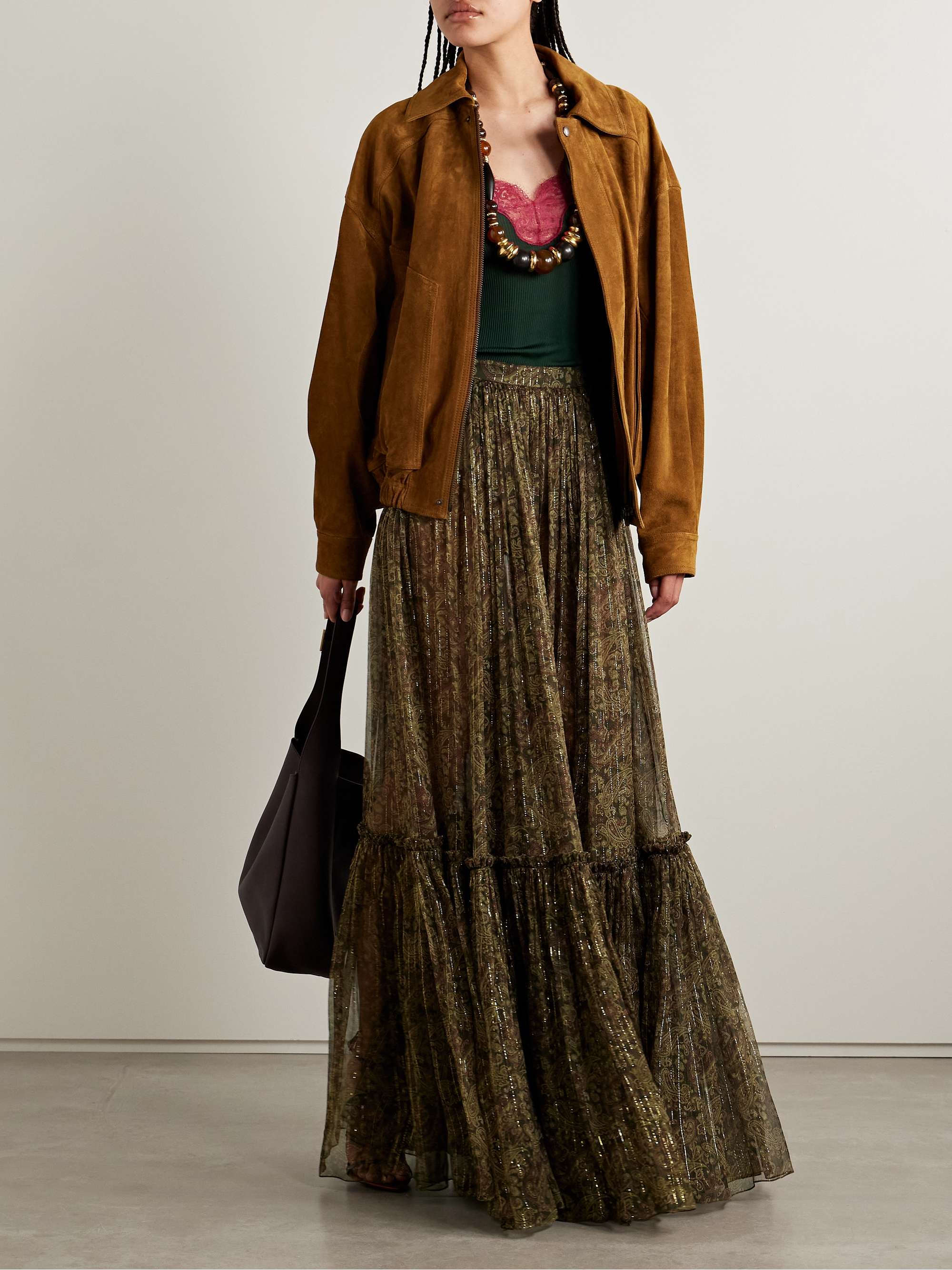 SAINT LAURENT Tiered metallic paisley-print silk-blend crepon maxi skirt