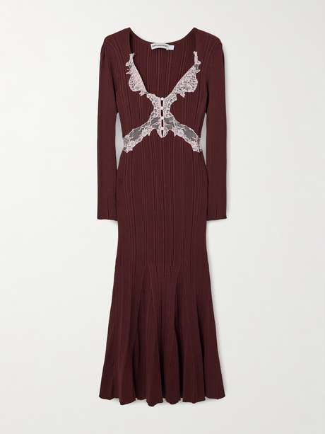 SELF-PORTRAIT Lace-trimmed ribbed-knit midi dress