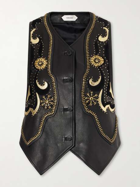 This Versace embellished leather vest is a statement layering piece, intricately detailed with ornate baroque-inspired embroidery and studwork throughout. Cut in a structured, slightly cropped silhouette, it frames the torso with a sculpted fit while the open front keeps the look effortless.
