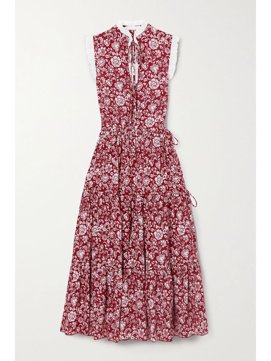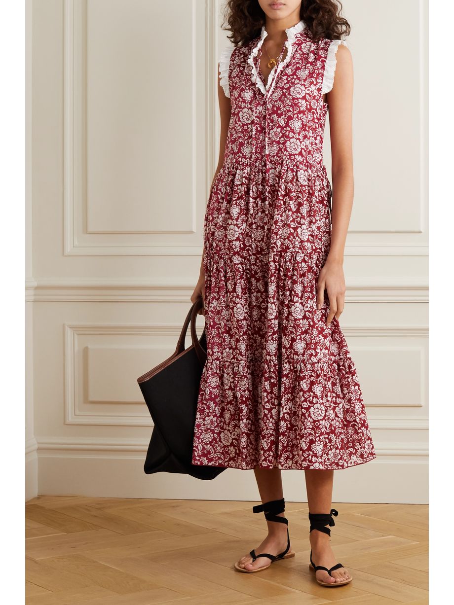 Broderie anglaise-trimmed tiered floral-print cotton midi dress