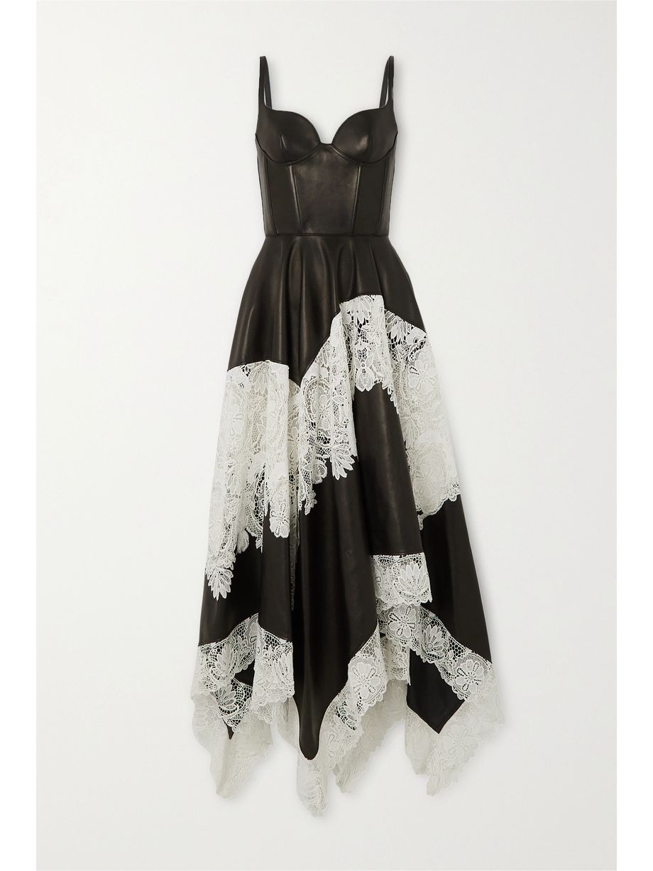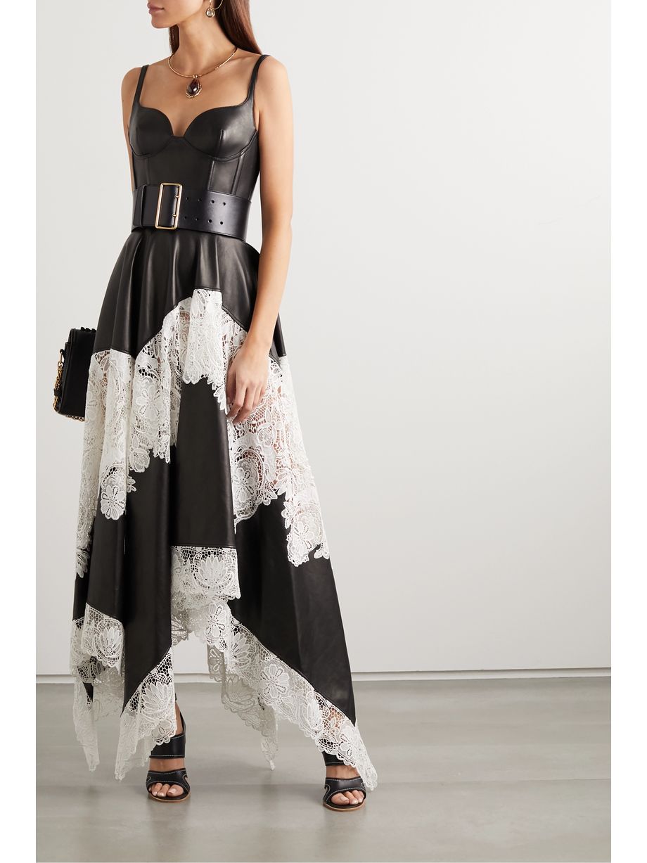 Leather and cotton-blend guipure lace gown