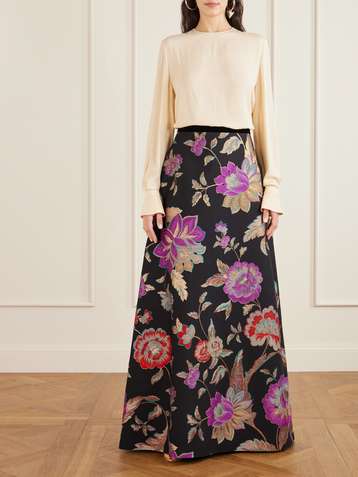 Velvet-trimmed wool-blend floral-brocade maxi skirt