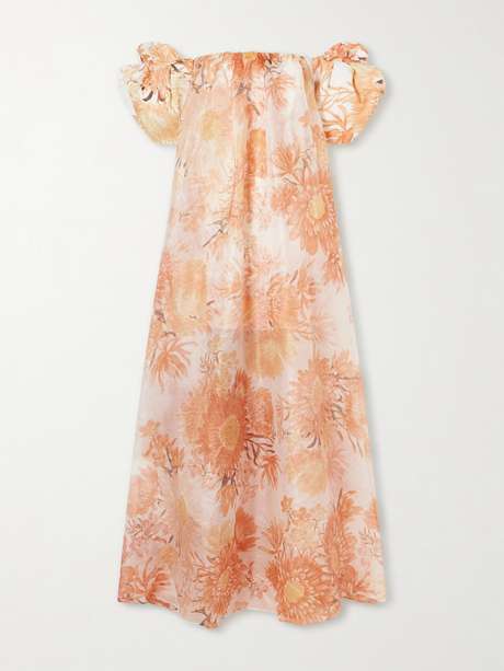Aje's 'Cosette' gown is patterned with painted orange blooms throughout. Crafted from linen-blend, it has an off-the-shoulder neckline framed by folded sleeves. Wear yours with a necklace.