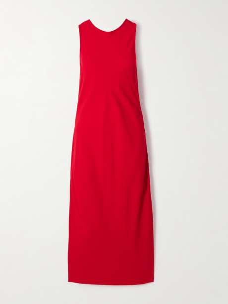 Another Tomorrow's midi dress is made from certified crepe that's blended with stretch for flex and durability. It's cut on the bias and has an elegant, draped cowl back. Complete your look with pumps and the brand's coat.