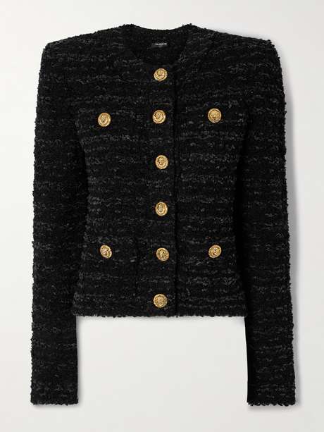Since its introduction to Balmain's collections in the '50s, tweed has become a symbol of the brand. This jacket is tailored from the tactile chenille fabric in a classic, collarless profile with the signature sharp shoulders. It's finished with the house's gold-tone lion buttons.