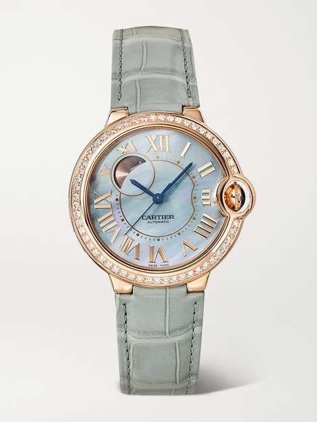 Cartier's 'Ballon Bleu' watch celebrates the beauty of curves. Made from 14-karat rose gold, it dazzles with diamonds and has a mother-of-pearl dial with blued steel hands to complement the cabochon sapphire at the fluted crown. The soft color of the alligator strap will work just as harmoniously with everyday denim as they will the most beautiful gown in your closet.