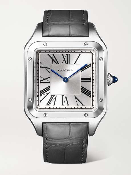 Cartier's timepiece was one of the first wristwatches ever made, designed in 1904 for Brazilian aviator Alberto Santos-Dumont. This extra large 'Santos-Dumont' model is made from stainless steel and detailed with exposed screws, which have become a Cartier hallmark. The blued sword-shaped hands and spinel crown beautifully complement the alligator strap.For warranty information, please refer to details & care