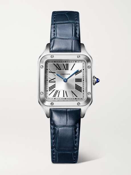 Cartier's 'Santos-Dumont' timepiece was first created in 1904 for Alberto Santos-Dumont, a Brazilian aviator - he wanted an alternative to the traditional pocket watch so that he could tell the time without taking his hands off the yoke mid-flight. Staying true to the original, this 38mm iteration has a squared stainless steel case bordered by eight screws and fastens with an elegant dark-blue alligator strap. The silvered dial has with blued steel sword-shaped hands and easy-to-read Roman numerals, which are both house signatures.