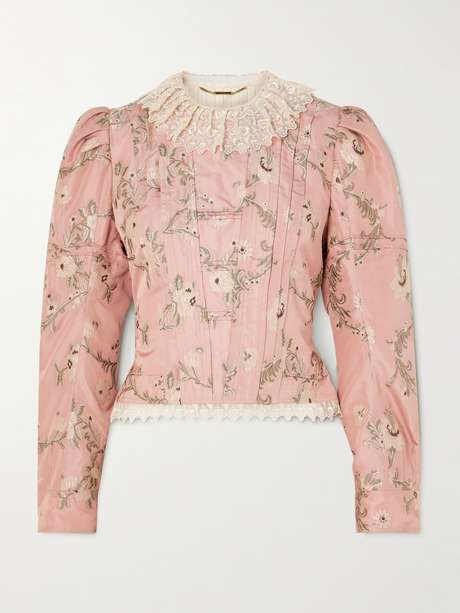 Chloé's Fall '25 draws on the charm of treasured heirlooms from bygone eras. The first look to debut on the runway, this jacket is cut for a cropped fit from floral silk-blend taffeta-jacquard and trimmed with lace at the collar and hem.