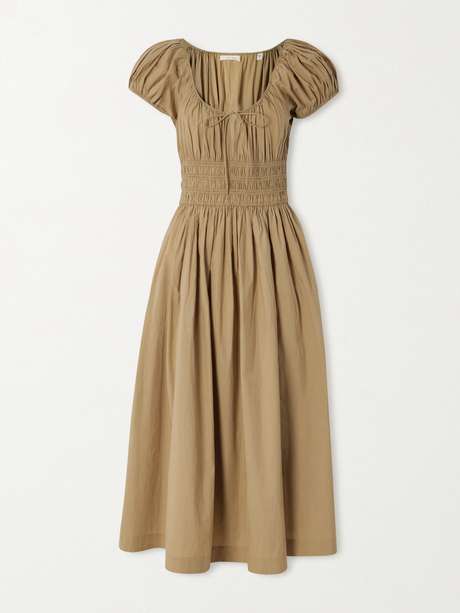 DÔEN Quinn tie-detailed shirred cotton-poplin midi dress