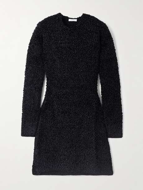 Ferragamo's mini dress has been made in Italy from plush jacquard-knit bouclé that has a sumptuously soft texture. It's cut for a close fit with a classic round neckline. Keep the styling simple – black pumps or ballet flats will work.