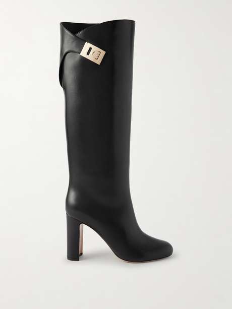 Ferragamo's 'Ennie' knee boots are embellished with the same gold hardware as the house's 'Hug' bags. They're made from smooth leather with rounded toes and 95mm block heels.