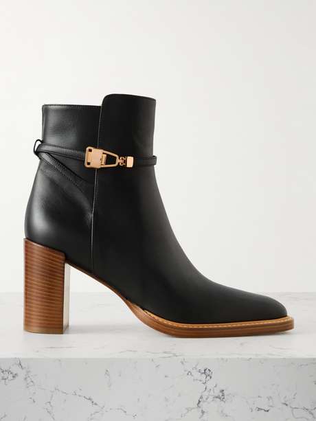 Gabriela Hearst's 'Nina' boots have a slim strap at the ankle fastened with a gilded clasp - the detail is reminiscent of riding stirrups. They're made from smooth black leather and rest on stacked wooden heels.