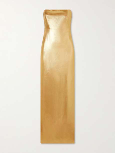 Galvan’s dresses are designed to be worn time and time again. Made from satin with a subtle sheen, this one has a strapless silhouette and an elegant side slit. Complement the copper shade with gold-tone jewelry.