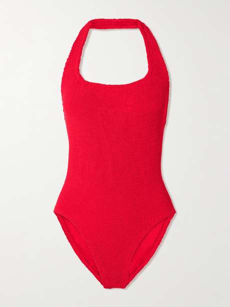 Hunza G's 'Sandy' swimsuit is crafted from the label's signature seersucker and re-imagined in a flattering halterneck silhouette. It features a square neckline and an open back. Timeless and versatile, it's a piece you’ll reach for on every getaway.