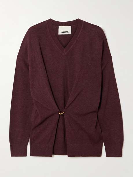 Isabel Marant reimagines modern knitwear with this 'Chiraz' sweater. Woven with touches of silk and wool, it's framed by a ribbed V-neckline and gathered with a gold-tone clip. Ribbed trims complete the look.