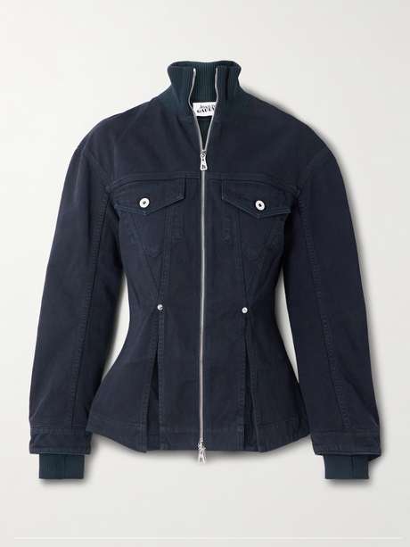 Jean Paul Gaultier's jacket is reminiscent of the denim corsetry from the Spring '93 collection. Outlined with tonal ribbed trims, it has a cinched, paneled design with split hems that enhance the hourglass shape.