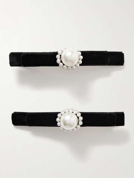 Jennifer Behr's 'Minetta' clips have a vintage-inspired charm. Made from silver-plated metal, each is topped with velvet ribbons and lustrous faux pearl flowers. Wear yours stacked or on either side of an updo.