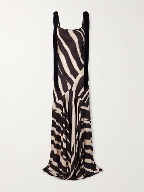NINA RICCI Bow-detailed velvet-trimmed zebra-print satin gown