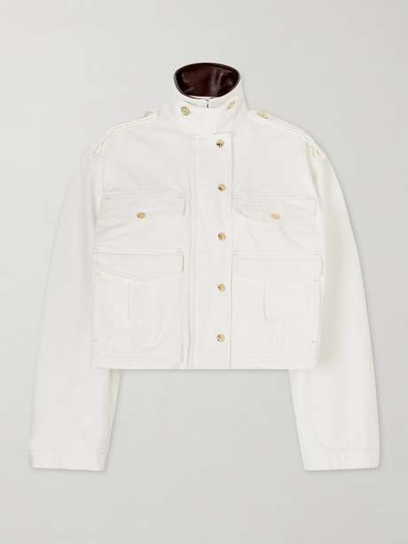 RÙADH’s 'The Henderson' jacket is crafted from cotton canvas in a classic trucker-style design with multiple patch pockets. An oxblood leather collar contrasts with gold-tone buttons, highlighting the crisp white shade. Style yours with jeans and boots.