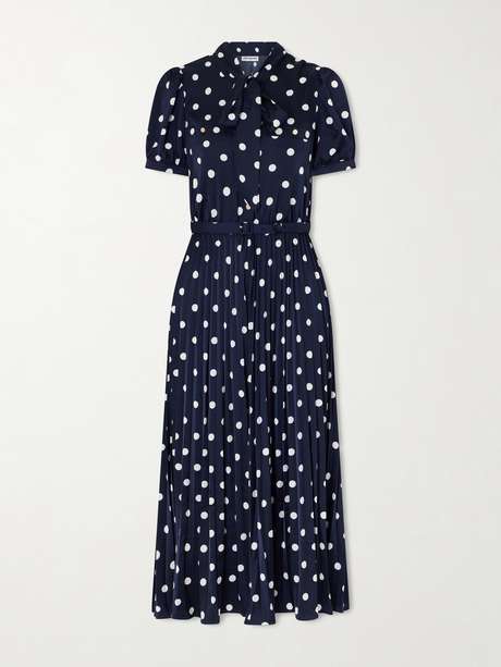 Self-Portrait balances vintage romance with modern polish. This midi dress is cut from lustrous satin patterned with playful polka dots and softly pleated for fluid movement through the skirt. A pussy-bow neckline frames the décolletage with feminine ease, lending the silhouette a poised, timeless finish.