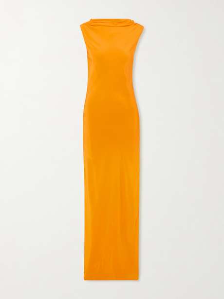 SIR's 'Isla' gown comes in a bold orange shade that's sure to command attention. Made from matte silk crepe de chine, it has a figure-skimming fit and a bateau neckline that gives way to a draped open back. Style yours with black accessories.