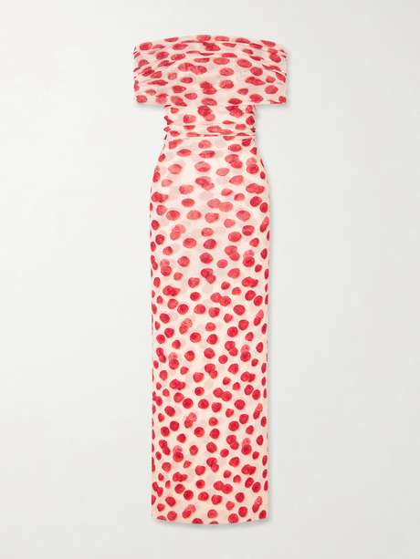 Playful yet poised, this raspberry-print chiffon dress by Stella McCartney brings a sense of lightness to occasion dressing. The softly ruched silhouette enhances its fluid shape, while the vivid motif adds a subtle sense of wit.