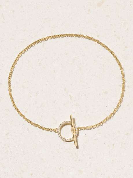 STONE AND STRAND creates delicate, timeless pieces that work equally well for day or night. This bracelet is handmade from 14-karat gold and centered with a diamond-encrusted T-bar fastening.