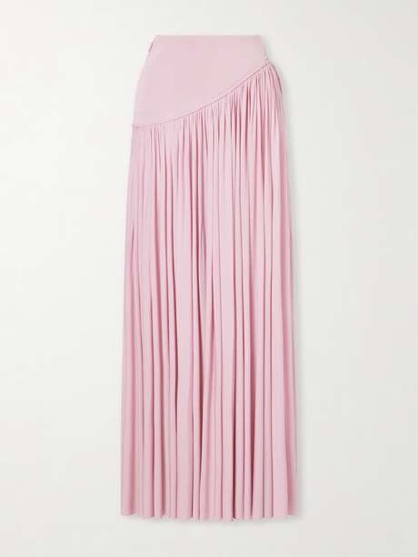 Zimmermann’s ‘Alchemy’ asymmetric skirt is crafted from crepe in a soft light pink hue. Designed in a fluid maxi silhouette, it features an asymmetric drape with gentle gathering that enhances movement through the shape.