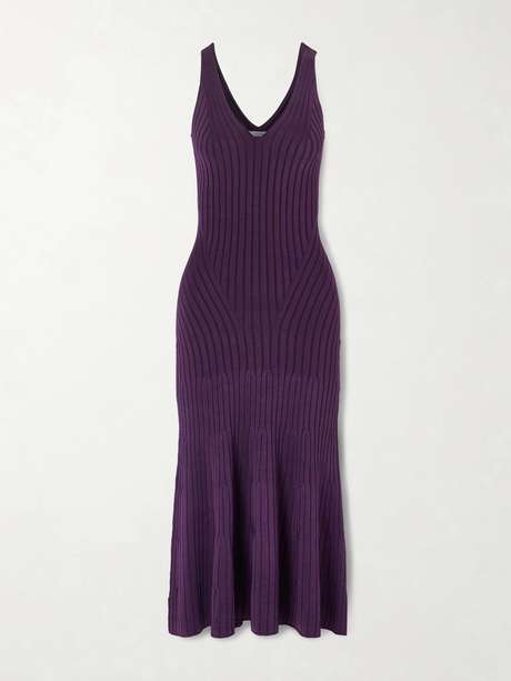 Effortless elegance is what Adam Lippes does best – it's why his dresses are so wearable and versatile. This 'Twyla' design is knitted from purple yarn in a ribbed stitch that contours the waist and hips before kicking out to a fluted midi skirt.