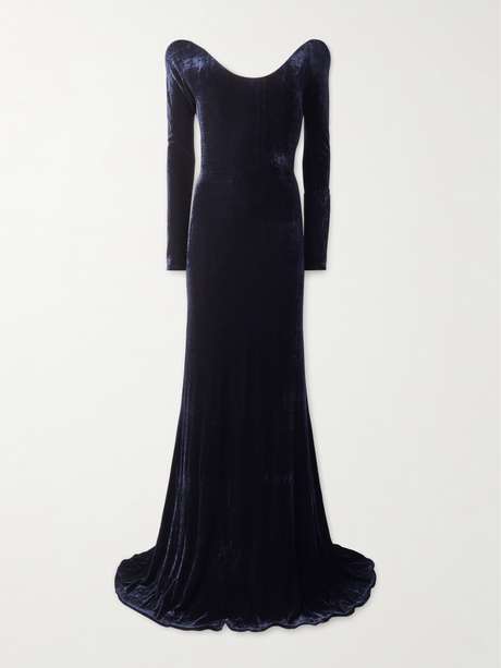 Alaïa's gown is defined by the curved off-the-shoulder neckline that gives way to a low-cut back. It's cut from plush velvet to skim your figure and falls to a floor-sweeping hem. Silver jewelry will complement the timeless midnight-blue shade.