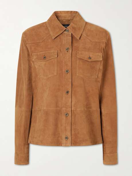 'Faye' jacket by ARMA is crafted from supple suede for a soft, smooth finish. The clean, structured silhouette sits neatly through the frame. Layer it over a simple tee or fine knit for an understated look.