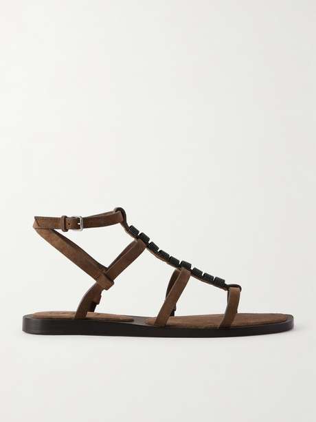 Brunello Cucinelli's gladiator-style sandals are defined by slim suede straps across the foot and ankle, with a string of tiny beads running down the center. Pair yours with a tiered floral dress or easy linen pants.