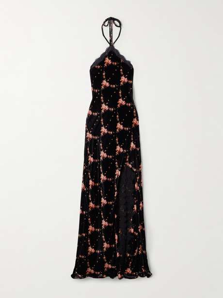 Cara Cara's 'June' dress is printed with vintage-inspired flowers arranged in a checked pattern. Cut from plush velvet, it has a figure-skimming fit and halter neckline trimmed with delicate scalloped lace.