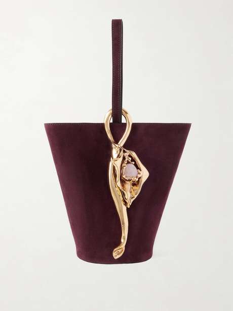 Chloé's 'Eden Treasure' tote is infused with poetic romance. It's made from velvety suede in a compact bucket shape and adorned with gold-tone hardware that resembles a blossoming flower bud. Inside, there's space for your phone, some cards and lipstick.