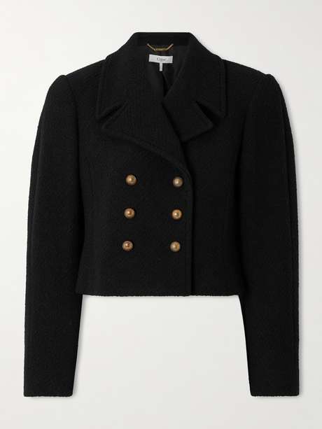 Chloé’s wool-blend jacket channels vintage military influences with a feminine twist. Tailored in a boxy, cropped silhouette, it features sharp peak lapels and a double-breasted front detailed with ornate gold-tone buttons.