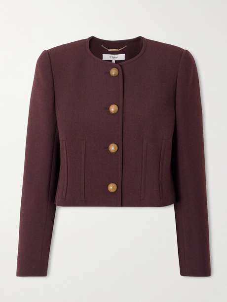 Chloé's jacket blends minimalist tailoring with a hint of vintage glamour. The cropped shape features a collarless neckline and sculptural darting that defines the waist. The rich plum wool-crepe and ornate gold-tone buttons nod to '60s couture.