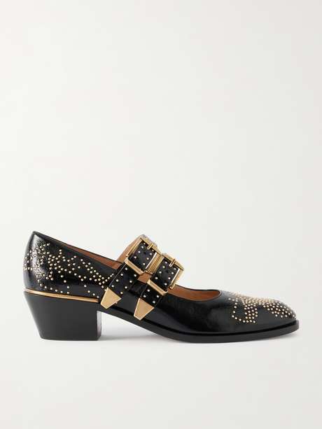 Chloé reworks its Western 'Susanna' boots into Mary Jane pumps for Spring '26. They're made from leather and detailed with gold-tone studs and buckles. They have 40mm Cuban heels.