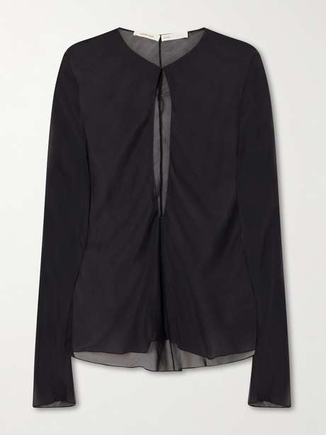 Colleen Allen’s blouse is crafted from sheer silk-chiffon with a close fit and an elegant front keyhole cut-out. Style it with tailored pants or a pencil skirt for a sleek finish.