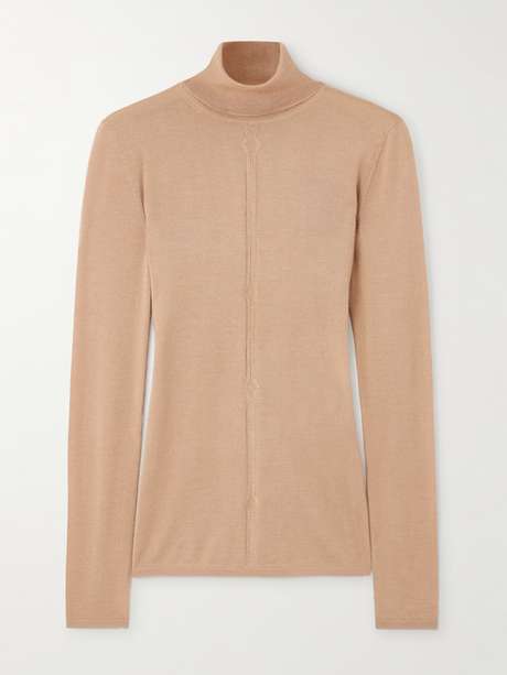 Gabriela Hearst's 'Steinem' sweater is knitted from cashmere with a touch of silk, giving it an even softer, smoother handle. It has a turtleneck collar and a ladder stitch through the front, which has a streamlining effect.