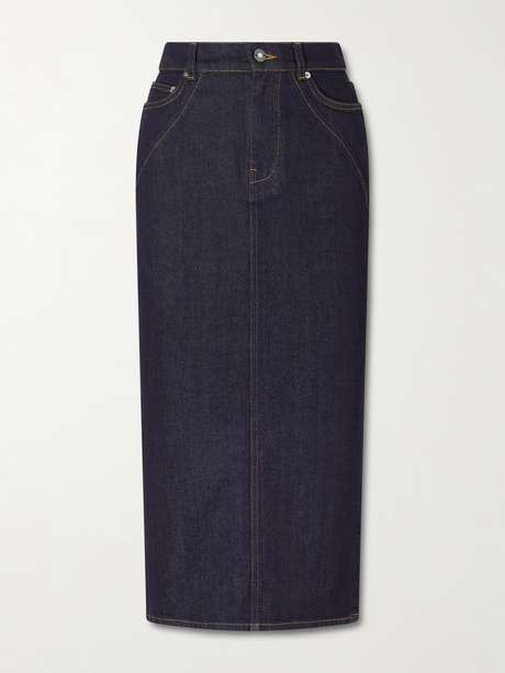 Givenchy's skirt is made from raw denim and outlined with classic orange topstitching. Designed in a glamorous column-inspired cut, it's finished with belt loops and paneled to created a fluted shape at the back.