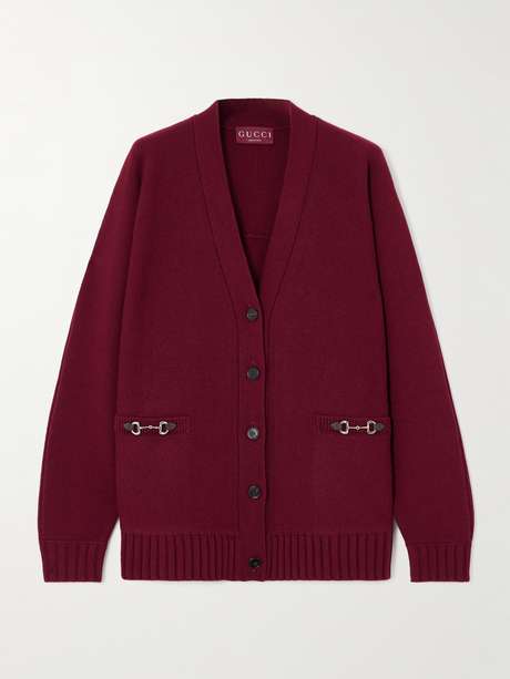 Gucci's cardigan draws the eye with polished horsebits. It's knitted from wool and cashmere-blend and has leather tabs holding the hardware in place.