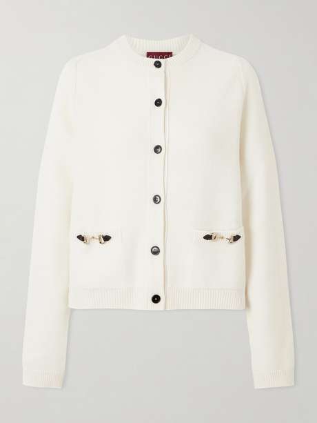 GUCCI Horsebit-embellished leather-trimmed wool and cashmere-blend cardigan